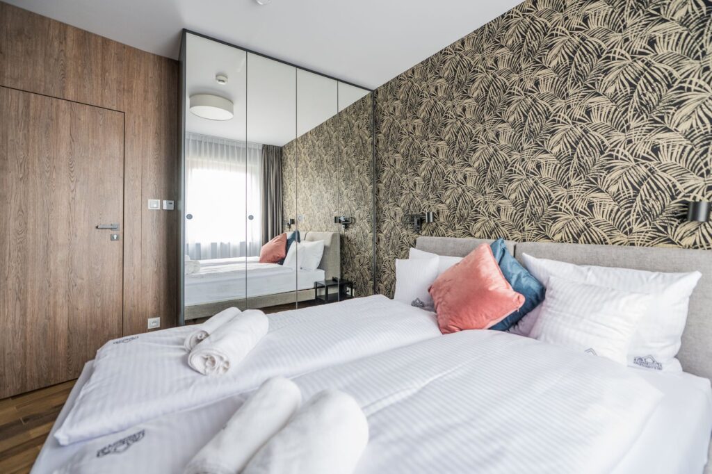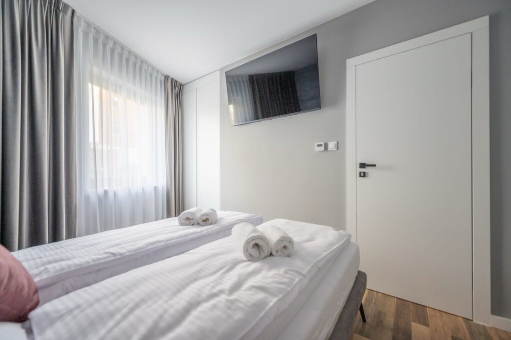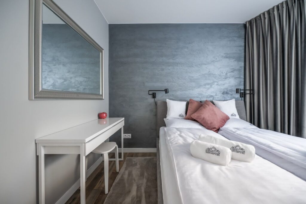 Nasze apartamenty składają się z 2 oddzielnych sypialni, salonu z aneksem kuchennym, łazienki oraz balkonu lub tarasu. Dla wygody naszych gości każdy z apartamentów posiada miejsce parkingowe w garażu podziemnym lub zewnętrzne miejsce postojowe znajdujące się na terenie obiektu oraz komórkę do przechowywana sprzętu sportowego (współdzielona dla 3 apartamentów). Dla najmłodszych na terenie naszego obiektu dostępny jest plac zabaw.